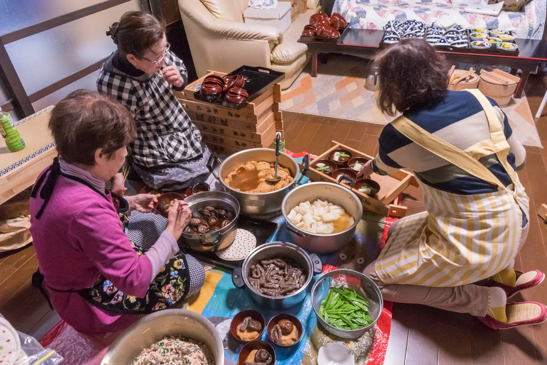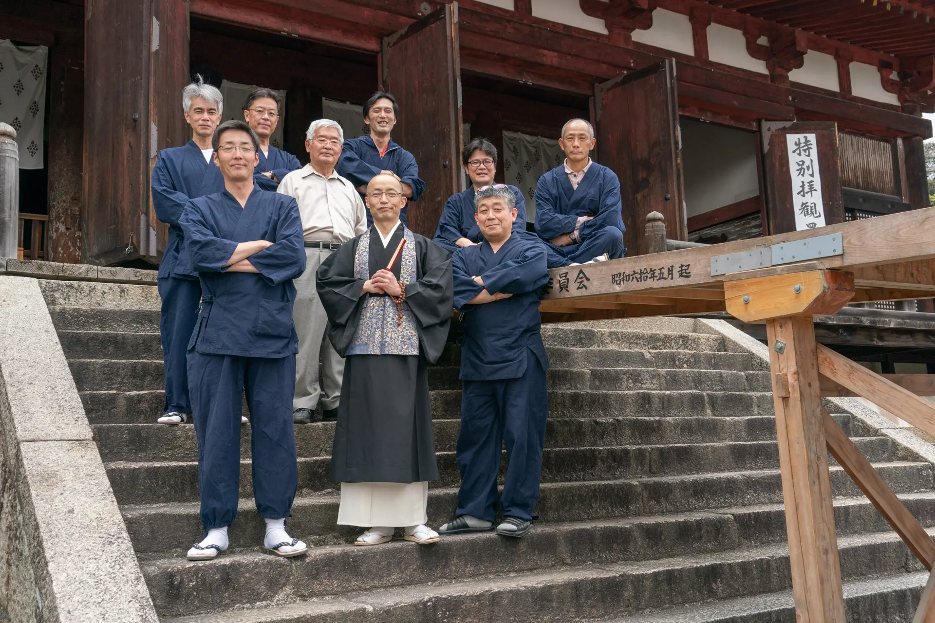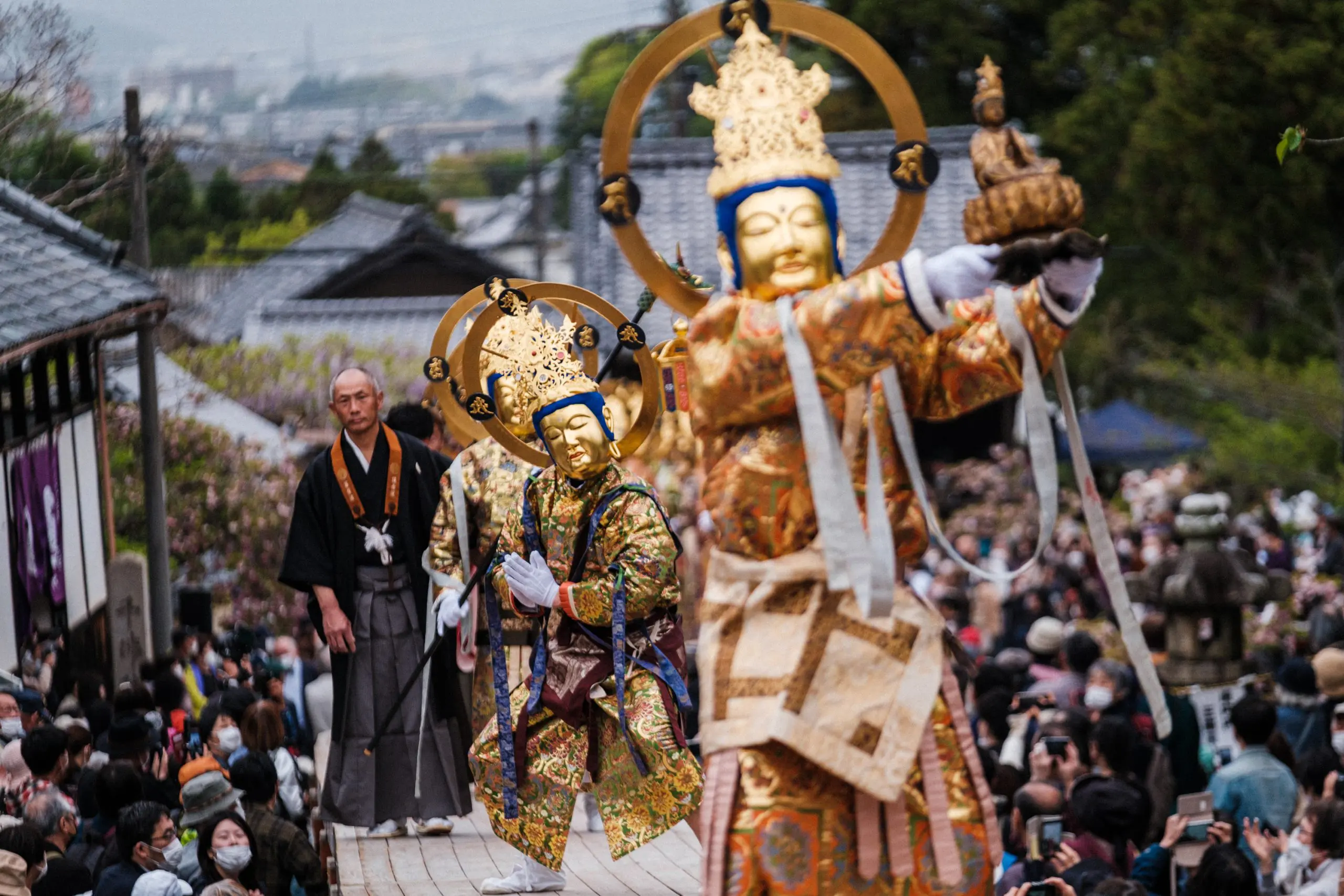 「當麻寺練供養会式」は千年以上の歴史があると云われます。その運営を担う「菩薩講」も、少なくとも300年繋がってきました。菩薩講員は、会式当日に菩薩役を務めるだけでなく、菩薩装束の着付けや所作の練習、会式の準備や後片付けに至るまで幅広い役割を果たし、伝統を支えています。