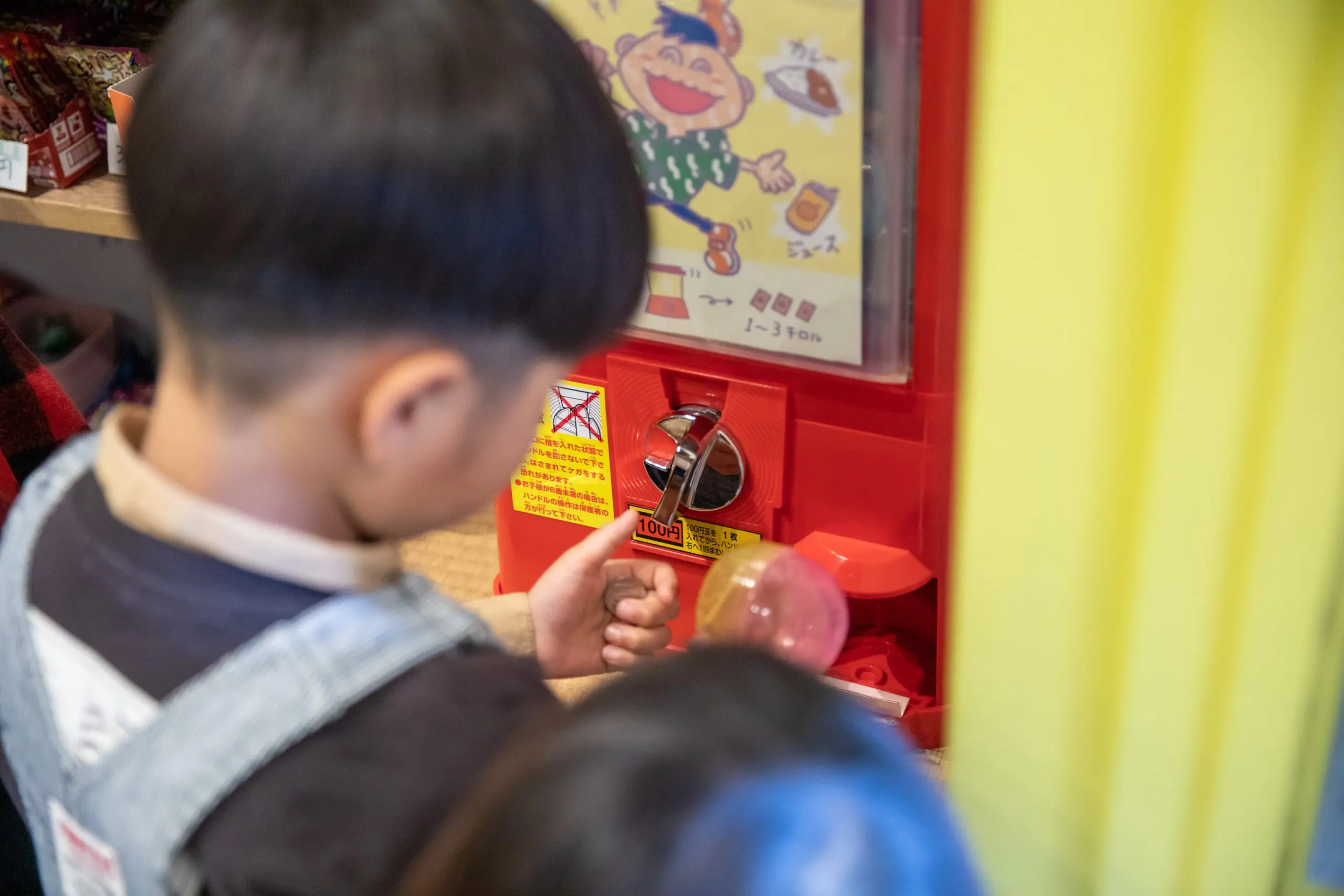 子どもたちは店に入るとガチャガチャの機械に100円を入れて、出てきたチロル札(1枚100円相当)で駄菓子を買います。時にチロル札が2枚や3枚出てくるため、100円以上の価値となることがあります。