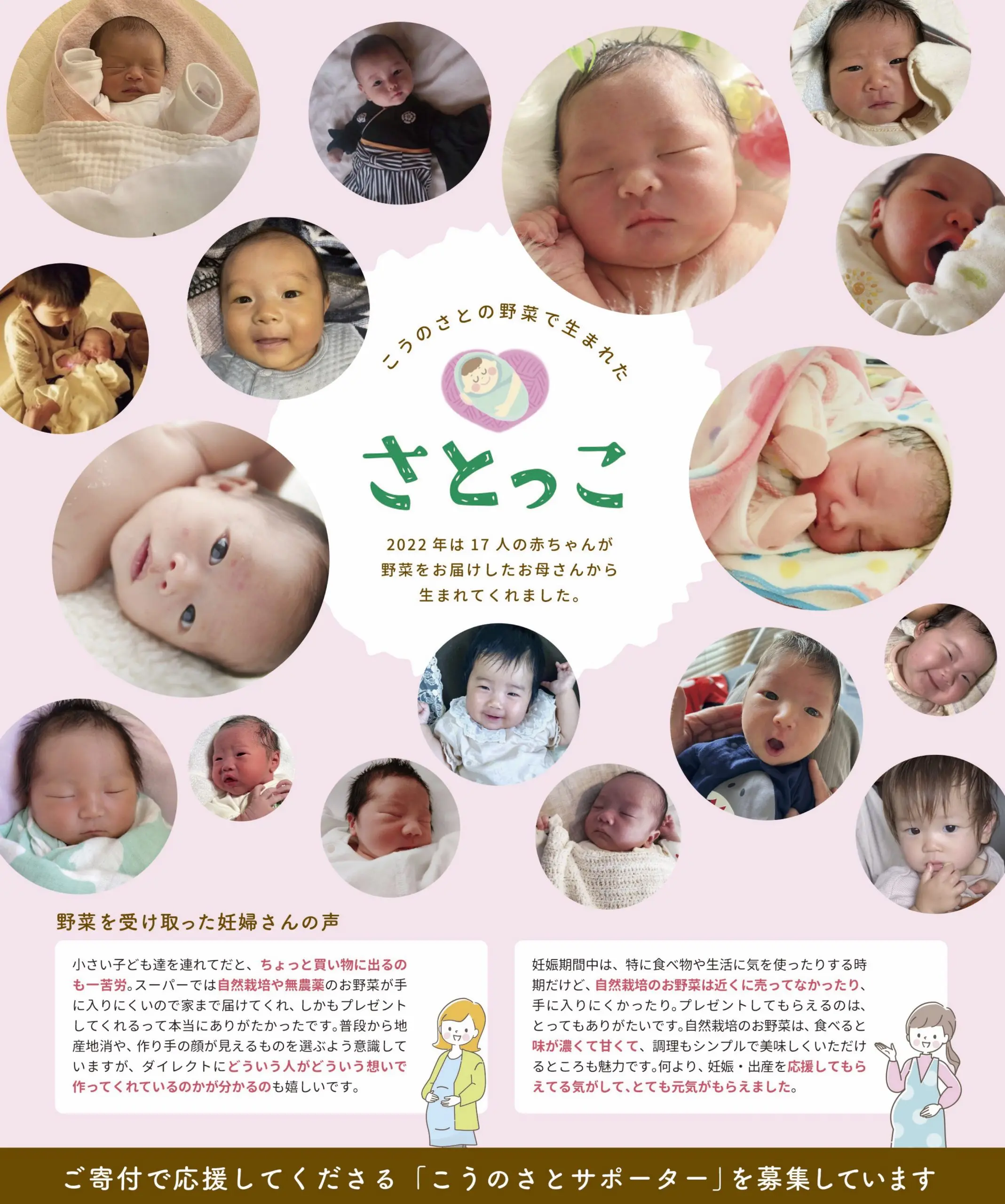 NPO法人こうのさとは、農薬や化学肥料を使用しない循環型の農業でお米やお野菜をつくっています。収穫したお野菜は、地域の妊産婦さんに定期的にプレゼントをして、お腹の中の赤ちゃんと緩やかな関係性をつくり、その誕生をみんなで祝福する地域をつくって行っています。