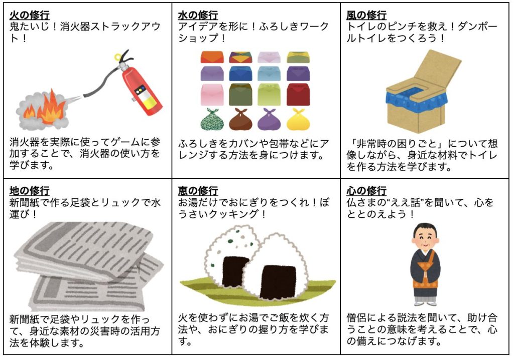 ・プログラム:お寺を舞台にした6つの修行(火・水・風・地・恵・心)をめぐりながら、防災を体験できる内容のスタンプラリー型ワークショップです。全ての修行を達成すると、特典を進呈します。
